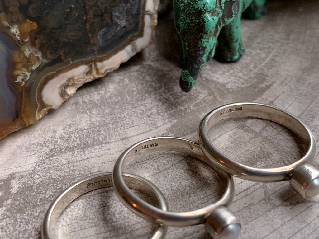 All are sized at about 7. Incredible shine. Next to perfect vintage condition. Set in sterling silver with metal markings inside each band.