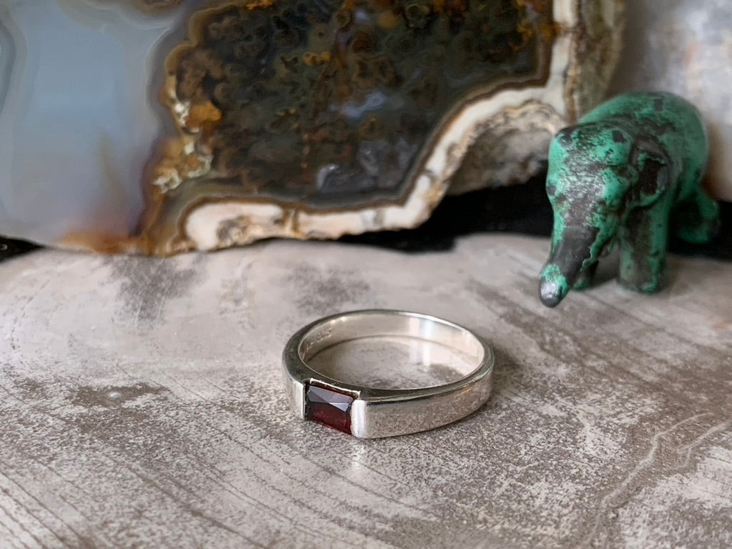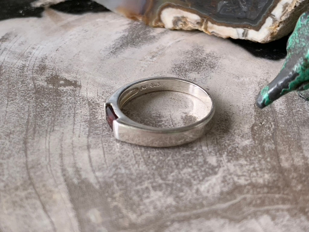 Love the simple things. Sterling silver set with a dark, luminous, piece of red glass.