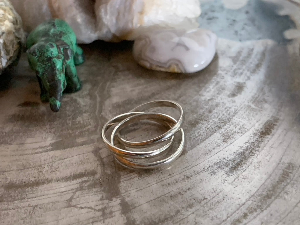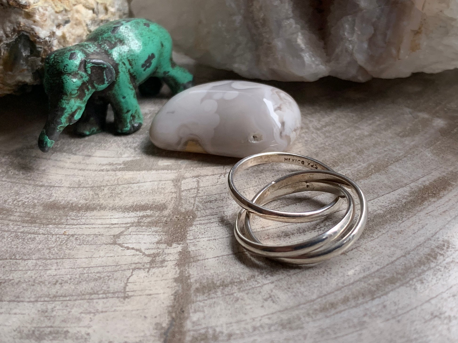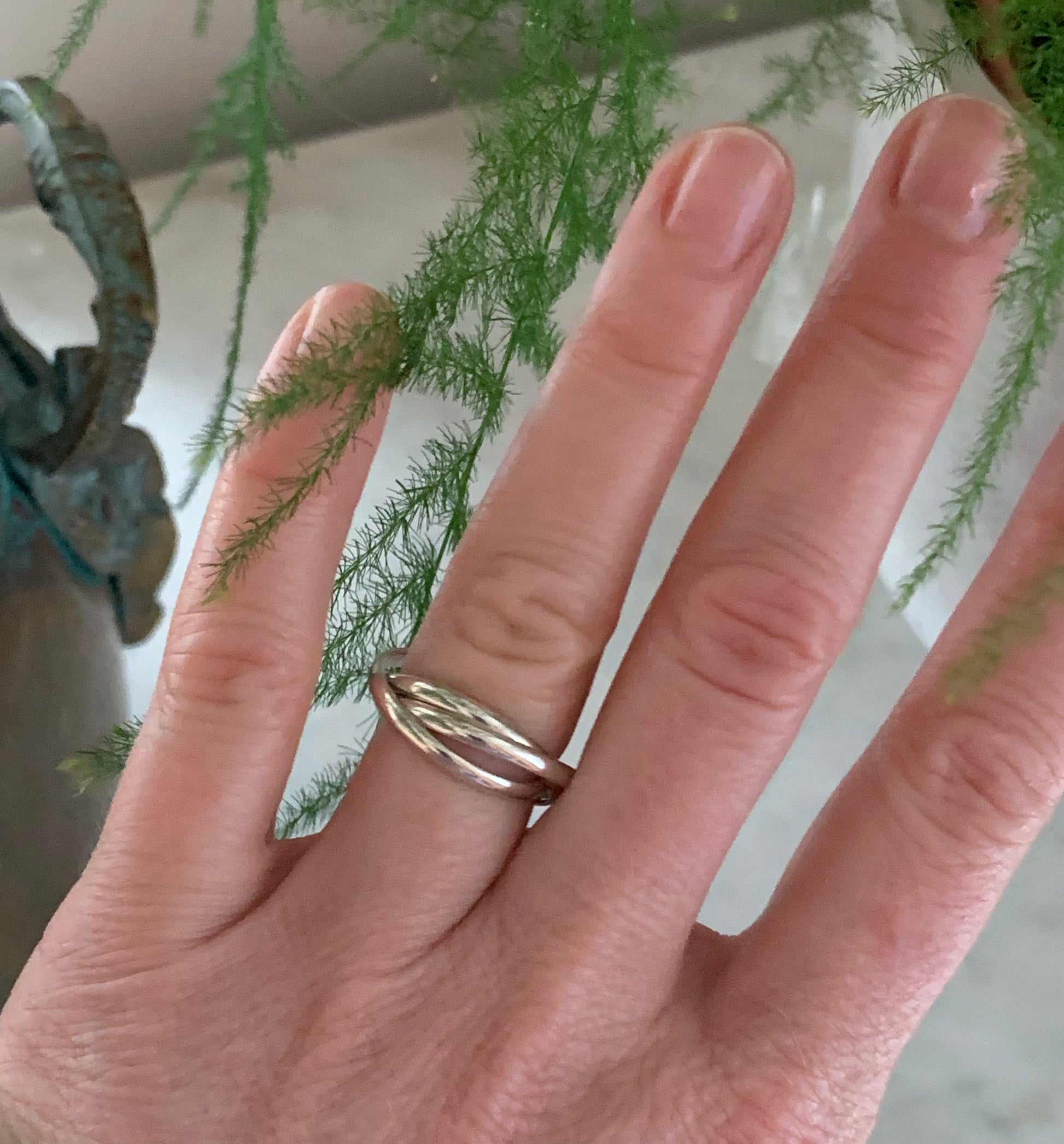 It's getting cold out and who doesn't love a bit of a squeeze. These three bands are intertwined, sterling silver, and sized at a very comfortable 6.