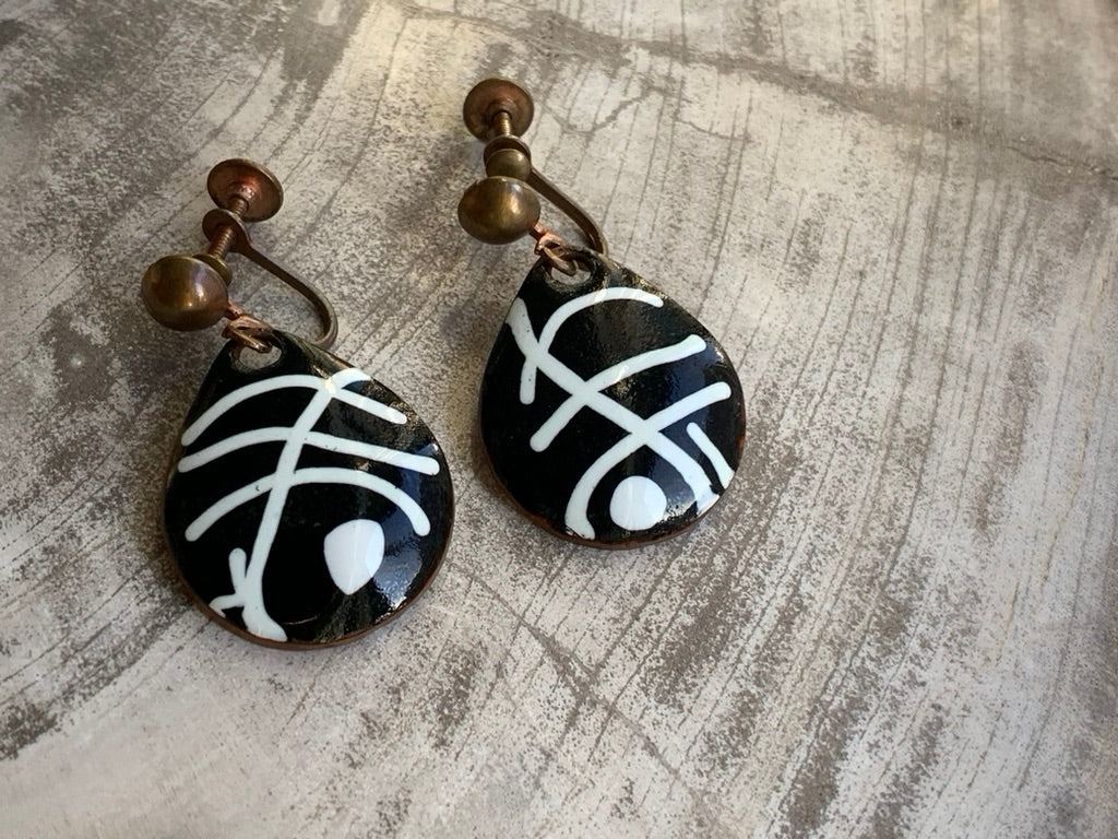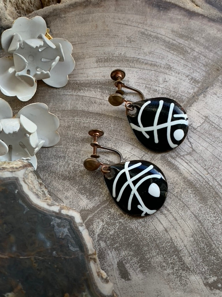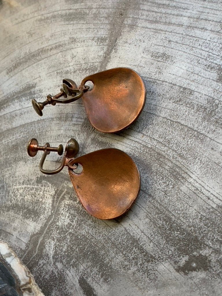 My love of mid-century modern continues with these vintage copper and enamel screw-backs. Enamel is flawless. So is any look you finish off with these. More to come.