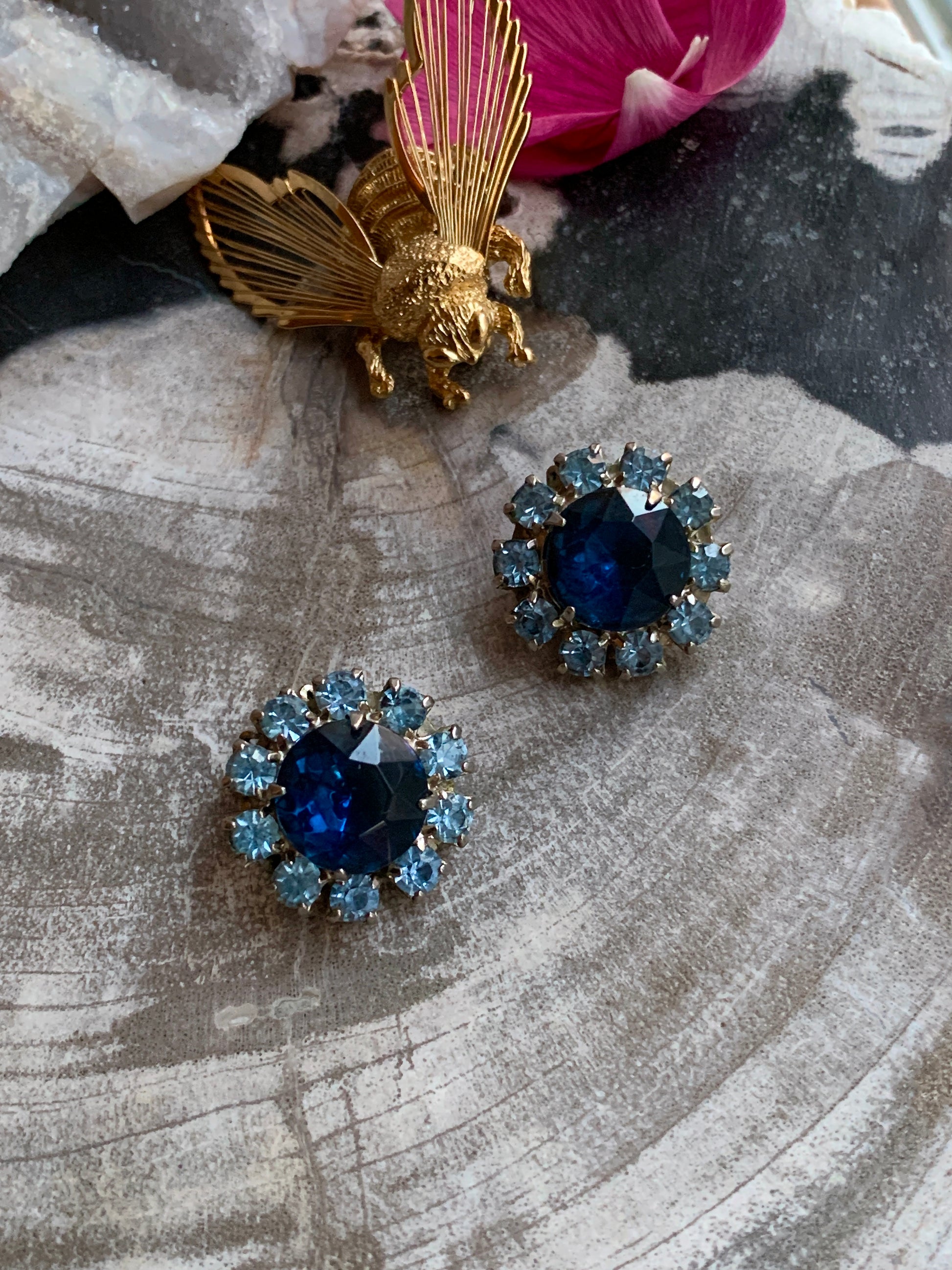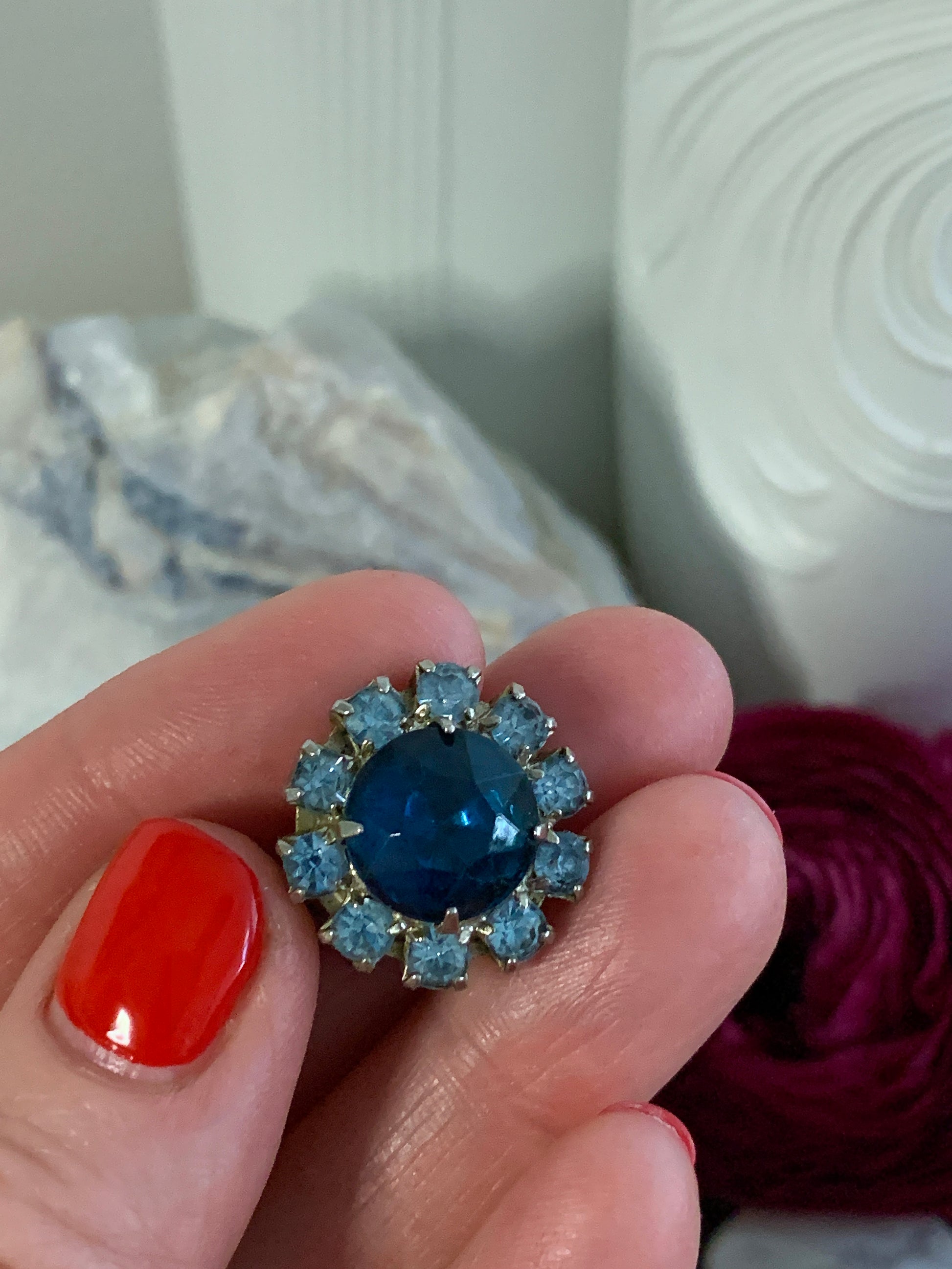 Pale blue stones encircle the darkest of blues. Simple perfection. Sparkle and cut (strongly) suggest rhinestones. Well-made ones.
