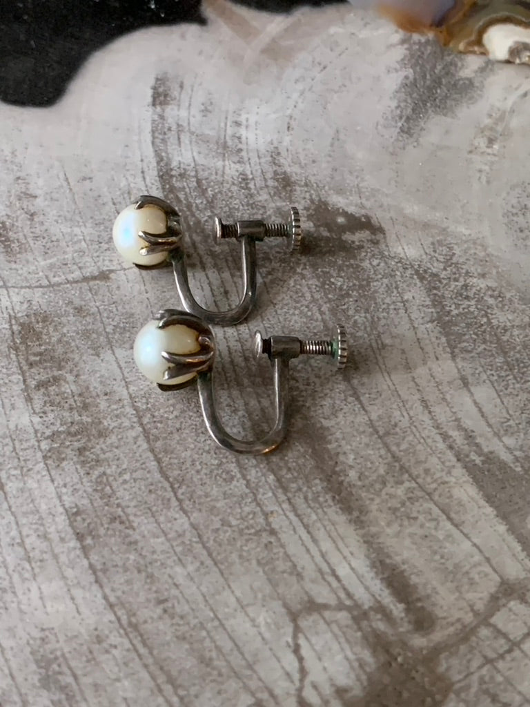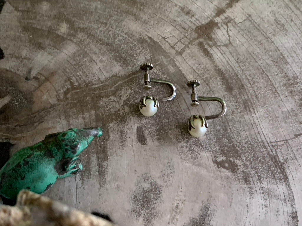 Antique pearls with a deep patina that entirely fits with a most unusual and slightly sinister setting. Does anybody else see claws?